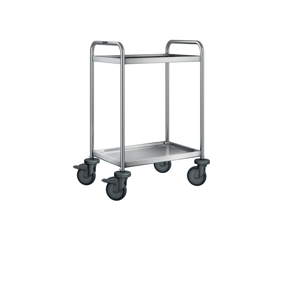 Dwie pojemne półki o wymiarach GN 600 x 400 mm oferują wygodną przestrzeń roboczą, a ich profilowane krawędzie zabezpieczające skutecznie zapobiegają zsuwaniu się naczyń podczas transportu – nawet przy intensywnym użytkowaniu.