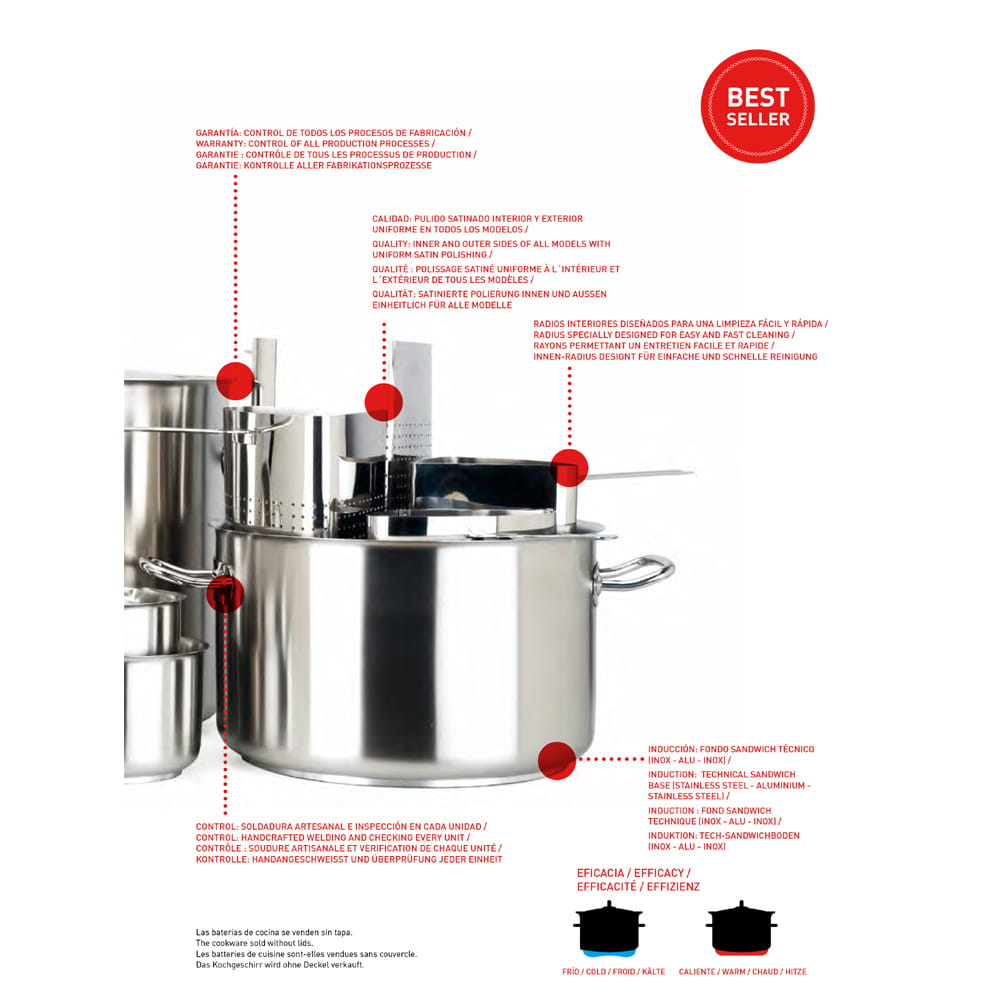 Specjalnie zaprojektowany, aby osiągnąć najlepszą wydajność w profesjonalnym gotowaniu. Korpus naczynia wykonany ze stali nierdzewnej 18/10. Bezpieczeństwo: spawane ręcznie uchwyty. Solidny i wytrzymały: rękojeść z drutu stalowego bardzo odporna, 500 kg. Wydajny: pokrywki zaprojektowane w celu oszczędzania energii. Unikalny: oznaczenie pochodzenia i rodzaj systemu gotowania. Gwarancja: kontrola wszystkich procesów produkcyjnych. Jakość: wewnętrzna i zewnętrzna strona wszystkich modeli z jednolitym satynowym polerowaniem. Specjalnie zaprojektowany do łatwego i szybkiego czyszczenia.
